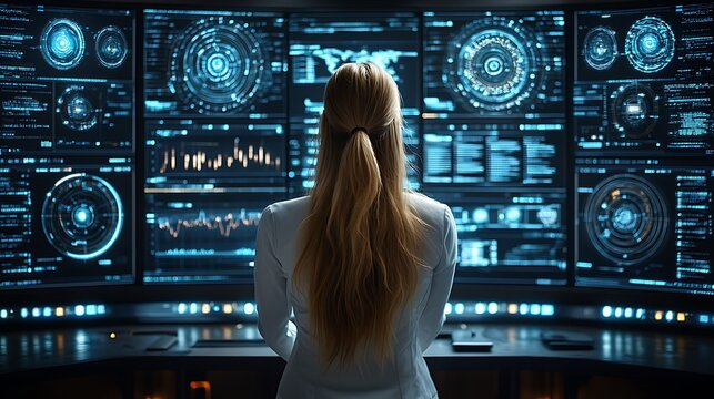 Woman viewing multiple screens displaying digital data