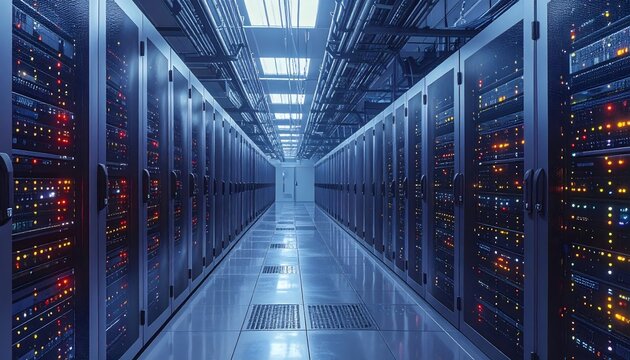 Modern data center interior with endless rows of blinking server racks, representing advanced IT infrastructure and technology.