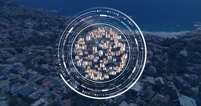 Image of scopes scanning and data processing on screens over traffic lights and cityscape