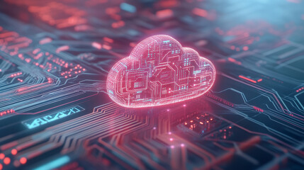 A glowing digital cloud symbol hovers over a circuit board, representing cloud computing technology and digital network infrastructure in a futuristic design.