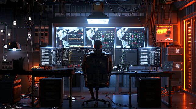 A male IT worker sits at his desk in front of computer monitors and looking computer screen, seen from behind and looking over the of an AI system that processes data on monitor displaying code