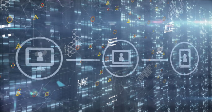 Image of data processing over chains and media icons