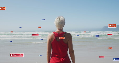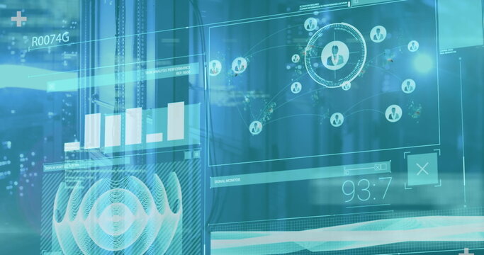 Image of digital interface with scopes scanning and data processing over woman exercising, lifting w