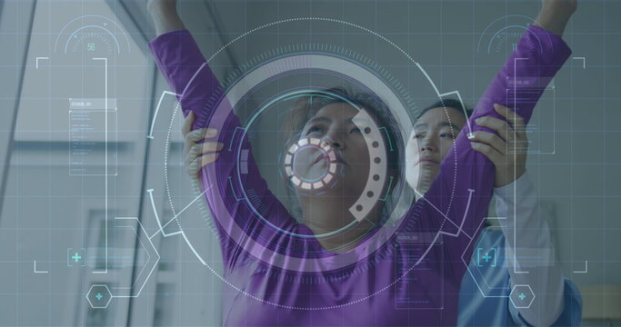 Image of scope scanning and data processing over asian woman exercising with nurse