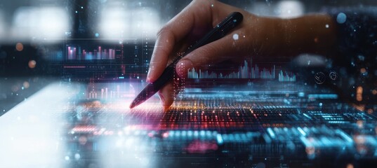Digital graphs floating over hexagonal grid with futuristic data analysis theme