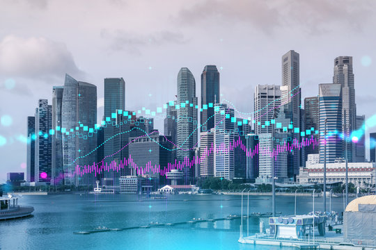Forex and stock market chart hologram over panorama city view of Singapore, the financial center in Asia. The concept of international trading. Double exposure.