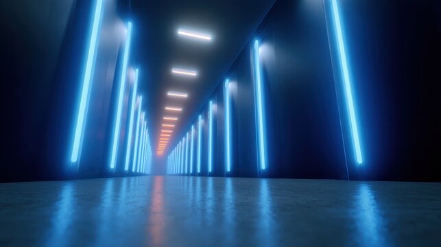 Futuristic data center hallway with server racks illuminated by neon lights represents technology