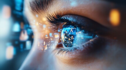 Close-up of an eye with digital reflections, symbolizing data processing and futuristic technology concepts