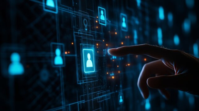 Digital recruitment concept shows a finger interacting with a glowing profile card in a minimal futuristic interface for candidate selection in a modern setting