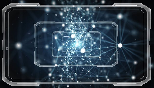 Futuristic design with digital connections and a central core of interconnected points. The overall aesthetic is clean, modern, and high-tech