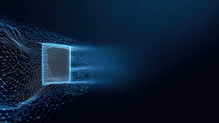 An abstract visualization of a digital cube emerging from a network of flowing particles, it shows innovative technology. ..Created with Generative AI, not depicting real subjects.