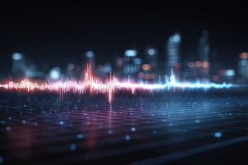 Abstract waveform overlaid on a city skyline at night, with illuminated dots