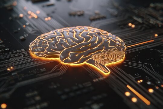 Glowing AI microchip on a digital circuit board background, symbolizing artificial intelligence and futuristic technology. 3d Rendering