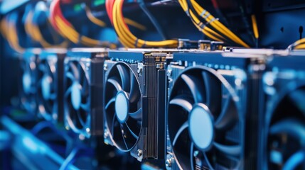 A futuristic server room filled with colorful, high-performance computer graphics cards, interconnected by cables.