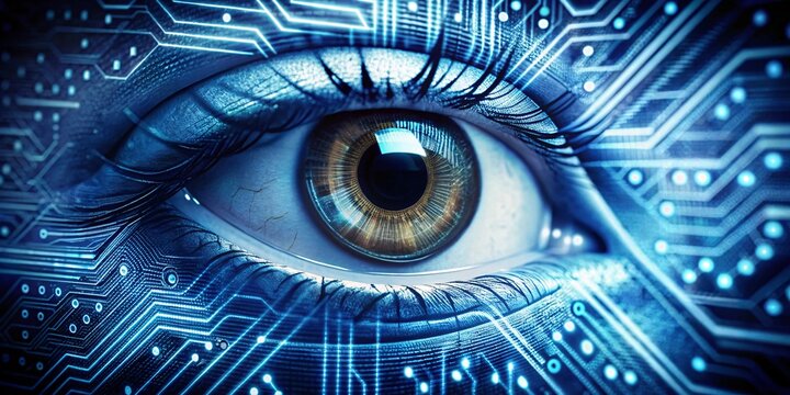A Glimpse into a Future of Enhanced Vision. A close-up view of a human eye with a digital overlay, featuring circuit board patterns and binary code.