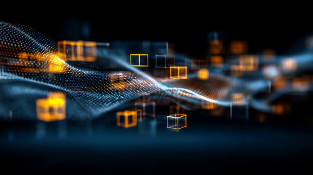The illustration shows a three-dimensional digital landscape composed of glowing lines, data streams, and abstract shapes in shades of blue and orange.