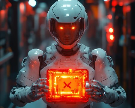 Futuristic robot figure holding a glowing red device with an "X" symbol, in a high-tech environment.