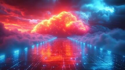 Futuristic server room with cloud computing symbol.  Neon lighting illuminates the server racks in a dark interior.  A large glowing cloud icon hangs above the central walkway