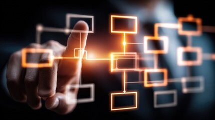 Interactive Interface: Man Touching Digital Flowchart Display for Business Solutions and Technology Integration, Innovation and Connectivity