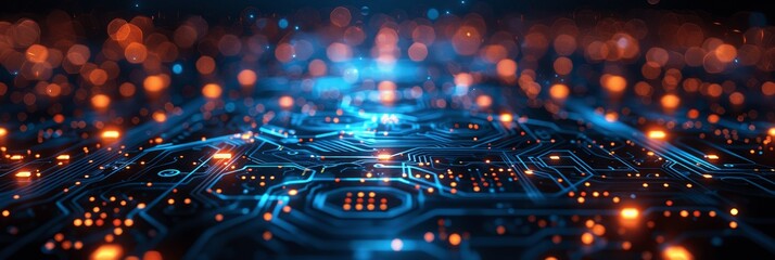 Futuristic Digital Technology Background with Glowing Data Lines and Circuit Board Elements in Dark Blue
