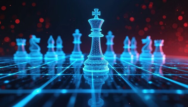 Abstract digital chess board composition. Glowing neon chess pieces arranged on tech grid. Concept of strategic thinking leadership. Futuristic business game design. Artificial intelligence