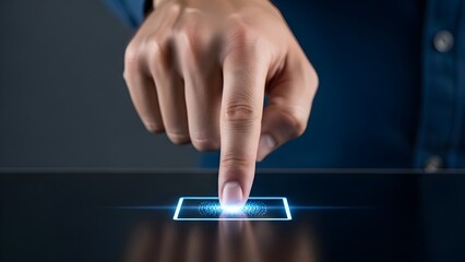 Close-up of a human hand pressing a glowing blue futuristic button on a dark surface