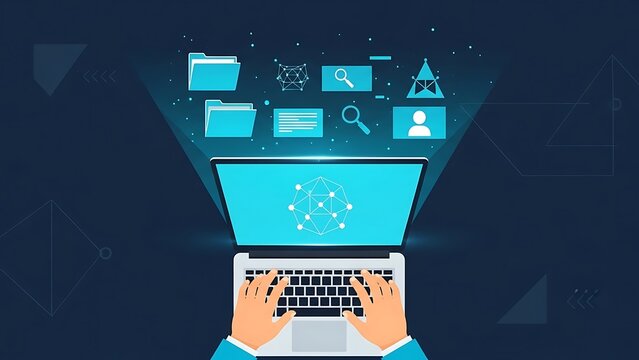 Laptop screen displaying an illuminated envelope icon against a blurred background with floating icons, concept for email marketing, digital communication and remote collaboration
