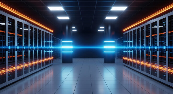 Server racks in a modern data center room with glowing lights. Fast internet and big data concept for high speed network communication.