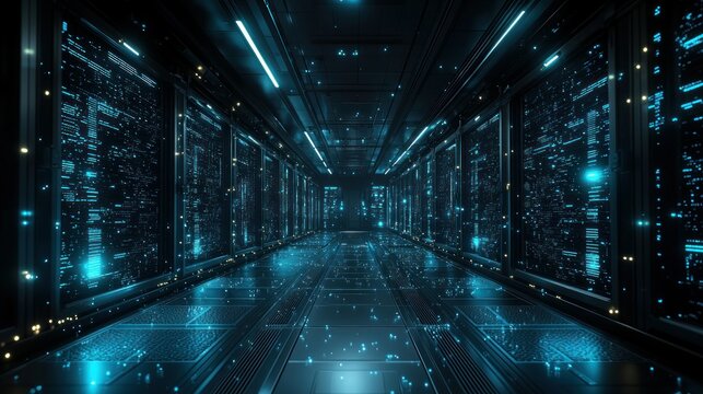 Futuristic data center corridor with rows of server racks displaying glowing blue binary code.