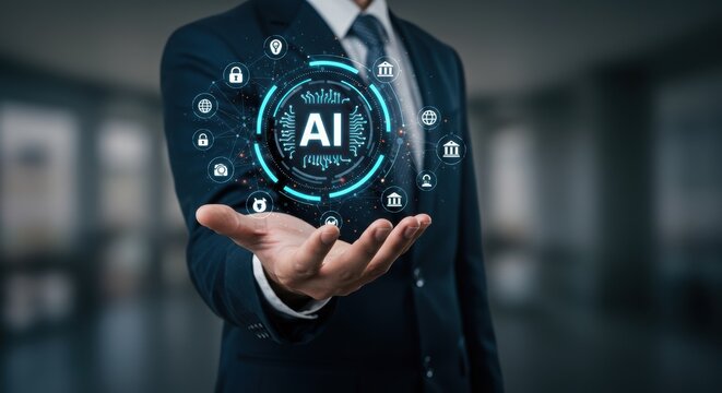 Futuristic AI technology concept with glowing hand and digital network. Modern innovation with interconnected data icons.