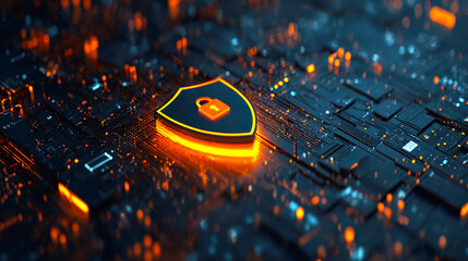 Futuristic Cybersecurity Concept with Digital Shield on Circuit Board Background in High-Tech Secure Environment