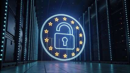 A futuristic data center with glowing lock symbol and stars, representing security and privacy in digital environments.