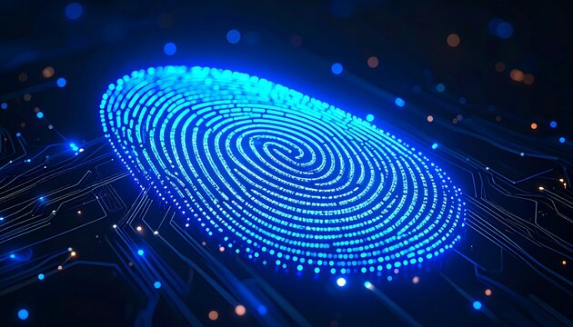 A futuristic digital fingerprint design, showcasing intricate details and glowing blue elements against a dark background.