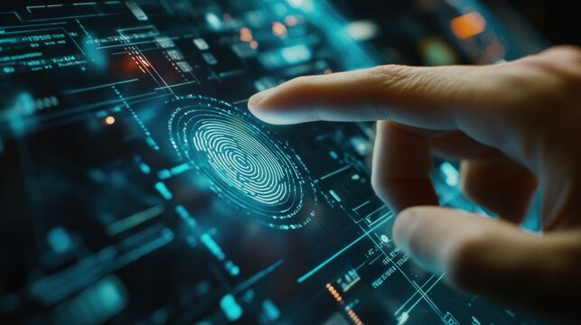 Biometric fingerprint scanning on futuristic digital interface