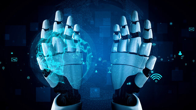 A visually striking image of robotic hands amidst a virtual digital landscape. This representation captures themes of technology, innovation, and futuristic concepts of connectivity. Xenic