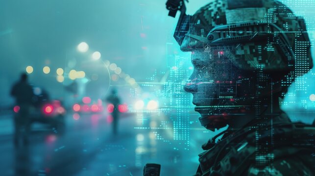 A soldier stands in the foreground, their face partially obscured by a digital overlay of data. The background is blurred, showing a cityscape at night with traffic lights and pedestrians. This image