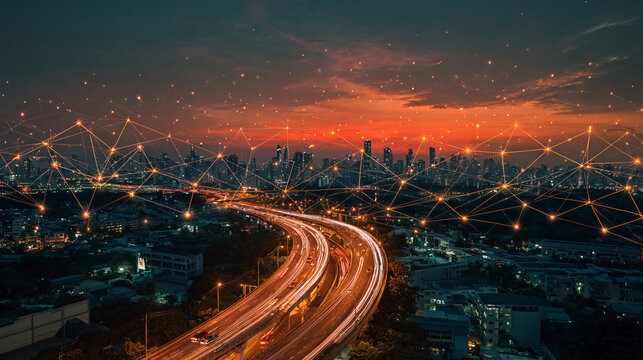 Modern office interior with futuristic digital overlay showing data streams and network connections.