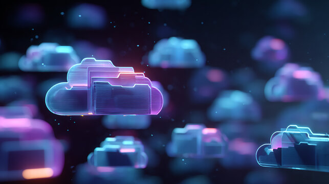 High-quality 3D illustration of cloud data storage with digital folders floating in a cloud network, futuristic technology concept, glowing interfaces, modern digital environment