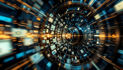 A futuristic tunnel with glowing data streams and security-themed elements. Digital circuitry and light trails evoke high-tech