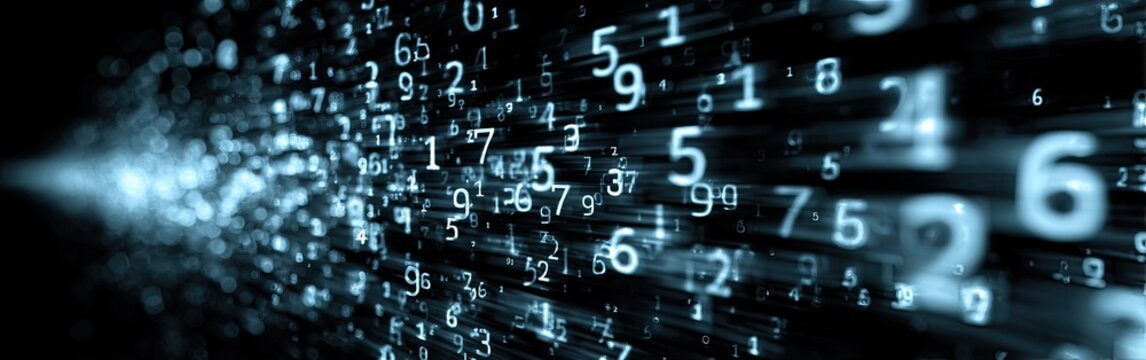 Glowing blue digital numbers float across a dark binary code background.
