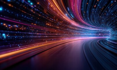 Abstract tunnel with glowing neon lights and data streams in futuristic environment