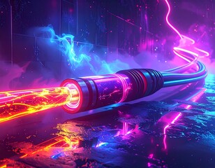 A close-up of a fiber optic cable emitting bright orange and red light, surrounded by a neon blue and purple futuristic environment.
