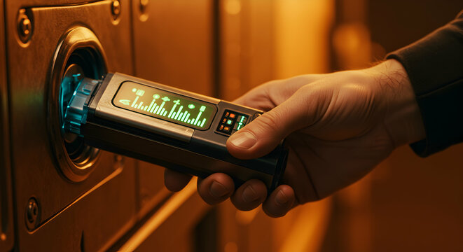Futuristic digital interface displaying data with glowing orange elements and intricate design, representing advanced technology and innovation.