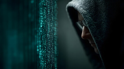Anonymous individual in a hooded sweatshirt silhouetted against multiple glowing computer screens displaying complex code and data