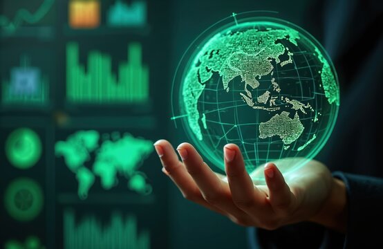 Hand holds glowing digital globe over data charts and world map graphic. Hyperrealistic visualization of marketing technology, data analysis, global business strategy, and system optimization.