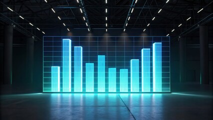A futuristic digital display featuring blue and cyan vertical bars representing data trends in a spacious, modern environment.
