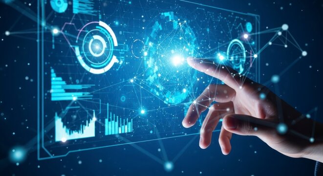 A hand interacts with a futuristic interface displaying complex data visualizations and network connections.