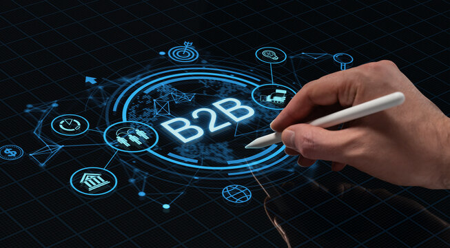 Hand using stylus to interact with futuristic B2B holographic interface on digital screen background illustrating tech business concept..