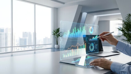 A business professional analyzing futuristic digital graphs and analytics dashboards on a tablet, showcasing data visualization, financial growth, and business intelligence in a modern tech environmen