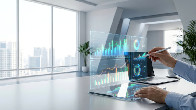 A business professional interacts with a futuristic laptop featuring holographic data visualization, highlighting financial trends and market analysis in a modern office environment. Scalp
